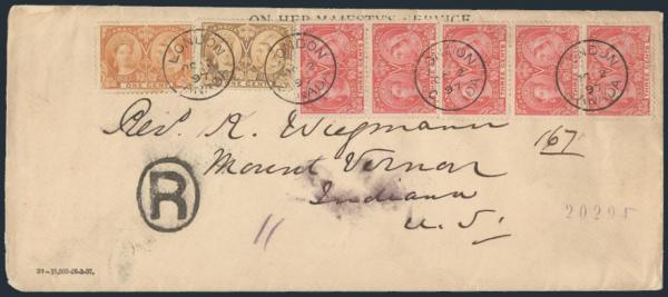 4797 51, 53 image51 (2), 53 (5), Neatly tied by London Ont 2 Oct, 1897 CDS's on OHMS Reg'd #10 size cross border cover to Mount Vernon, Indiana. Has numerous b/s's. The stamps pay an unusual 17¢ RATE. F (Image) Estimate 225.00+ $Cdn