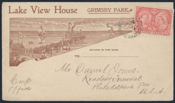 4800 53 image53, Tied by Grimsby Park Ont 17 Aug, 1897 split-ring on gorgeous illustrated advertising cover for the LAKE VIEW HOUSE in Grimsby Park. Depicts shoreline scene with pier, steamboats, other boats, etc. Addr to Philadelphia (partial b/s). A SCARCE COVER & IN CHOICE CONDITION. VF (Image) Estimate 275.00+ $Cdn