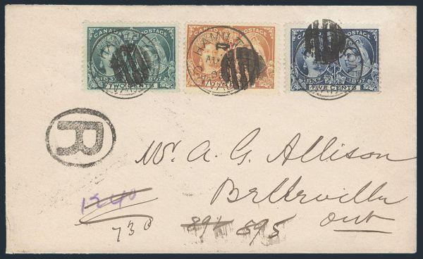 4798 51-2, 54 image51-2, 54, Three diff QV Jubilees tied by Hamilton Aug 1897 CDS's & cork cancels on Reg'd cover to Belleville, Ont (rec b/s). VF (Image) Estimate 150.00+ $Cdn