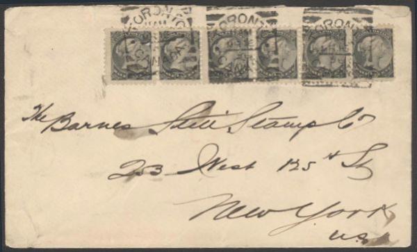 4782 34 image34, Two ½¢ Small Queen 1896 covers from Toronto to New York. Each with horiz strips of 6 (with a couple of amazing jumbos). One cancelled by Toronto squared circles, the other by Toronto duplexes. F (2) (Image) Estimate 90.00+ $Cdn