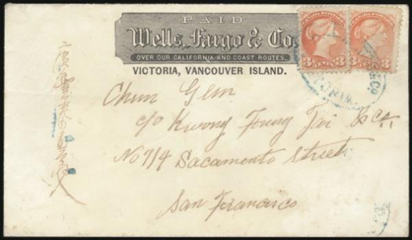 4790 37ii image37ii (2), Tied by blue Wells, Fargo & Co. Victoria oval cancel in blue on cover (circa 1873) with WELLS, FARGO & Co. VICTORIA VANCOUVER ISLAND printed PAID frank in black, addr to San Francisco. F, some soiling. Scarce (Image) Estimate 750.00+ $Cdn