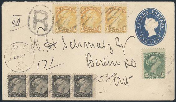 4783 34, 35, 36 image34 (strip of 4), 35 (strip of 3), 36, Tied on QV 2¢ Postal Stationery envelope from Crediton Ont 21 Ap, 1894 to Berlin Ont. The stamps pay the 8¢ Reg'd rate. Backstamps incl 2 diff RPO's plus has red wax seal. F, minor back flaws. A nice cover from the "Schmalz" correspondence (Image) Estimate 150.00+ $Cdn