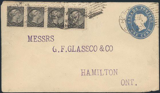 4781 34 image34 (Strip of 4), Tied by Montreal 26 Mar, 1895 duplex cancels on QV 1¢ Postal Stationery envelope. Addr to Hamilton, Ont (rec b/s). F (Image) Estimate 50.00+ $Cdn