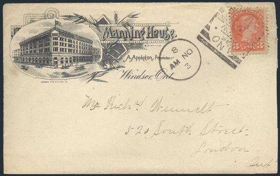 4791 41 image41, Tied by Windsor Ont 2 Nov, 1896 Squared Circle on illustrated advertising cover for the MANNING HOUSE hotel. Addr to London, Ont. F, a bit reduced (Image) Estimate 100.00+ $Cdn