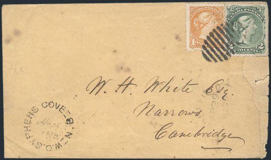 4778 24, 35iv image24, 35iv, Tied by oval grid cancel on cover from W.O. Syphers Cove NB 26 Ap, 1872 CDS (date in m/s), to Narrows Cambridge. Has Georgetown NB b/s. VG+, cover is faulty at right but a nice Way Office cancel & nice franking (Image) Estimate 200.00+ $Cdn