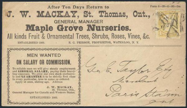 4786 35 image35, Tied by cork cancel on unsealed printed matter rate advertising cover for J.W. MACKAY / MAPLE GROVE NURSERIES in St Thomas, Ont. Addr to Paris Station Ont (rec b/s). F-VF. A PRETTY ADVERTISING COVER (Image) Estimate 100.00+ $Cdn