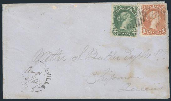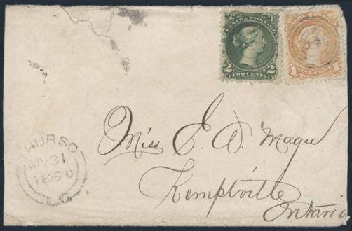4777 23-4 image23-4, Neatly cancelled by target cancels paying the 3¢ rate on a cover from Thurso LC 31 May, 1869 to Kemptville Ont (rec b/s). Has Ottawa transit b/s. VG+, cover reduced, some edge flaws (Image) Estimate 150.00+ $Cdn