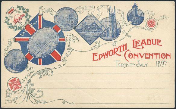 4793 51 image51, Unused 1¢ Jubilee affixed on a very early advertising postcard for the EPWORTH LEAGUE CONVENTION, TORONTO 1897. Has fancy coloured design with scenes of Toronto, Beaver, wreath, Maltese Crosses, etc. F, couple creases (Image) Estimate 75.00+ $Cdn