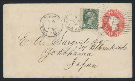 4787 36 image36, Tied by Montreal 30 Dec, 1892 duplex cancels on QV 3¢ Postal Stationery envelope addr to YOKOHAMA, JAPAN. Has Vancouver and Yokohama b/s's. F, minor age stains mostly on reverse (Image) Estimate 250.00+ $Cdn