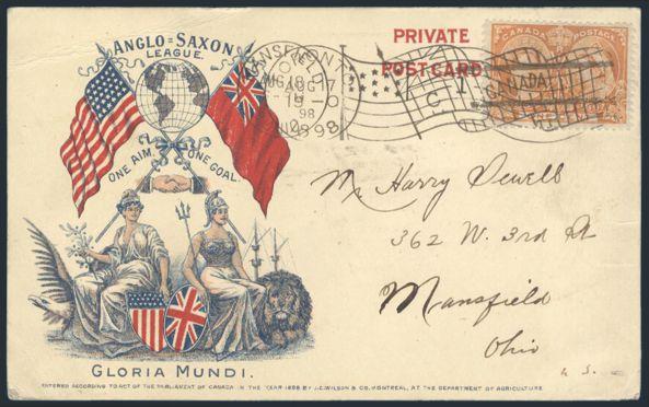 4796 51 image51, Tied by Toronto 17 Aug 1898 Flag cancel with Mansfield Ohio 18 Aug 1898 American Flag cancel overtop on nice J.C. Wilson colour Patriotic cross border postcard. Entitled "GLORIA MUNDI" with crossed Canadian / American flags, Shields, etc. F, corner crease (Image) Estimate 200.00+ $Cdn