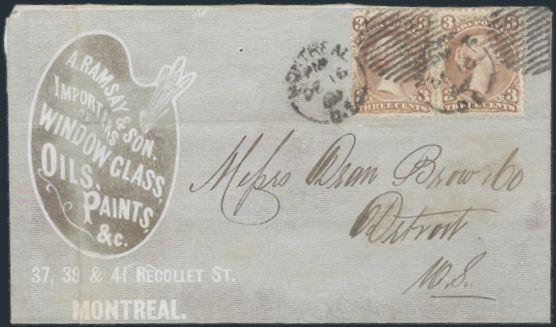 4779 25 image25 (Pair), Tied by Montreal 16 Dec, 1868 duplex cancels on cross border folded letterhead to Detroit, Mich. Has lovely illustrated advertising for A. Ramsay & Son Window Glass, Oils, Paints. Depicts an artist's palette. F, couple file folds (Image) Estimate 225.00+ $Cdn