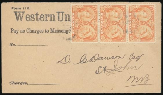 4794 51 image51, VF (Strip of 3), Tied by faint West Chester, NS 19 Aug 1897 split-ring cancels on postally used "Western Union Telegraph Co" cover to St. John, NB. F-VF. Nice franking (Image) Estimate 75.00+ $Cdn