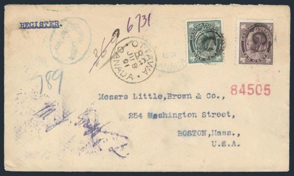 4806 70, 73 image70, 73, Each stamp tied by circular "C" cancel on Reg'd cover from Ottawa 8 Ju, 1901 on cross border cover to Boston, Mass (rec b/s). Has blue House of Commons Canada cancel. On reverse has Library of Parliament imprint of flap & Montreal Precursor. Has been endorsed handstamp of M.J. Griffins. VF (Image) Estimate 400.00+ $Cdn