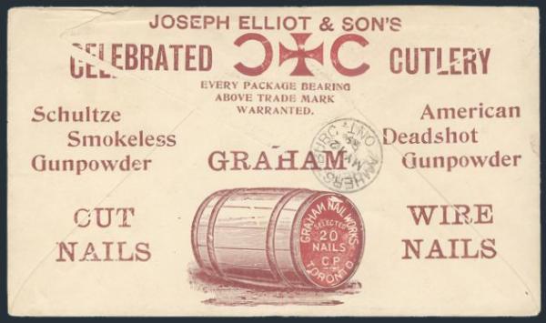 4818 76 image76, Tied by Toronto 11 May, 1899 "E" Flag cancel on advertising cover for Howland & Sons Co. Wholesale Hardware. On reverse has "all over" illustrated advertising for GUNPOWDER, NAILS, CUTLERY, etc. F (Image) Estimate 75.00+ $Cdn