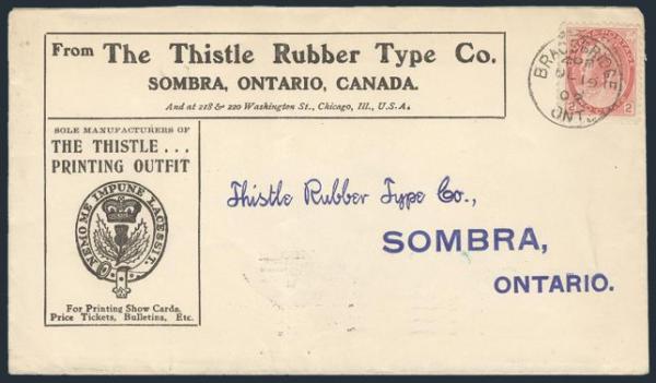 4823 77 image77, Tied by Bracebridge Ont 19 Dec, 1902 CDS on illustrated advertising cover for The THISTLE RUBBER TYPE Co. of Sombra, Ont. Addr to Sombra (rec b/s). F, slight crease (Image) Estimate 50.00+ $Cdn