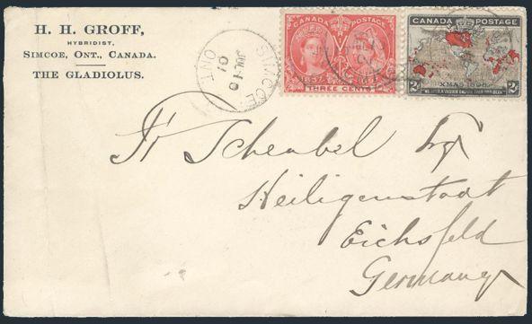 4804 53, 85 image53, 85, Nice mixed franking paying 5¢ overseas UPU rate from Simcoe Ont 10 July, 1901 to GERMANY (rec b/s 18 July, 1901). Has interesting corner card for a Hybridist in Simcoe. The 2¢ Map has a "MUDDY WATER" variety. F, couple light creases (Image) Estimate 125.00+ $Cdn