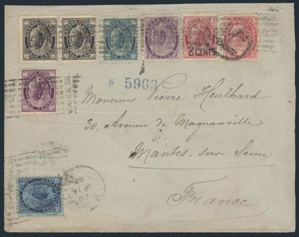 4805 66-8, 76-7, 87 image66-8, 76-7, 87, Nice mixed franking of QV Leaf Numerals and Surcharge tied by Montreal roller cancels & 14 Sept, 1903 CDS on cover to France (rec b/s). The stamps pay 15¢ double weight UPU rate. F (Image) Estimate 135.00+ $Cdn