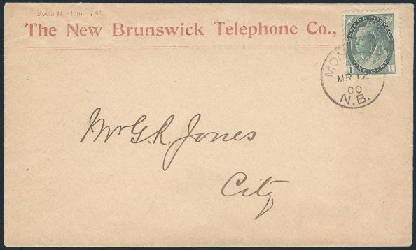 4817 75, 98 image75, 98 (2), Three diff covers from 1900-8 all with diff coloured corner cards for THE NEW BRUNSWICK TELEPHONE CO. One is addr to Rothesay NB with fully dated Squared Circle b/s. F. Scarce group (3) (Image) Estimate 100.00+ $Cdn