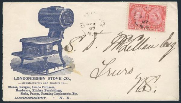 4802 53 image53, With Chester Place 3 Sep 1897 split-ring cancel on beautiful illustrated advertising cover for Londonderry Stove Co. (illustrations front & back). F-VF (Image) Estimate 150.00+ $Cdn