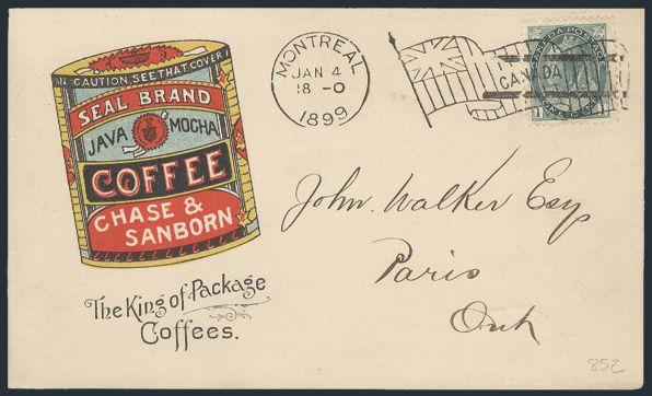 4811 75 image75, Tied by Montreal 4 Jan 1899 flag cancel on beautiful multi-coloured advertising private postcard for Coffee. VF (Image) Estimate 125.00+ $Cdn