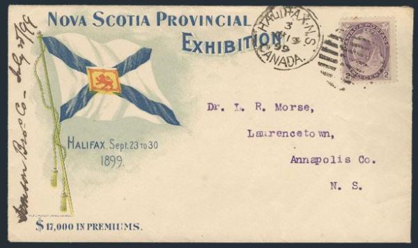 4820 76 image76, Tied by Halifax 19 July 1899 duplex cancel on beautiful multicoloured illustrated advertising cover for the Nova Scotia Provincial Exhibition. F, some slight wrinkles (Image) Estimate 100.00+ $Cdn