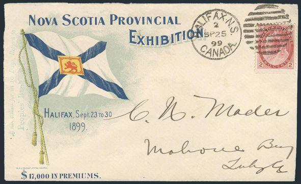 4821 77 image77, Tied by Halifax 25 Sp, 1899 duplex on colour illustrated cover for the 1899 NOVA SCOTIA PROVINCIAL EXHIBITION. Addr to Mahone Bay. F, a bit reduced (Image) Estimate 85.00+ $Cdn