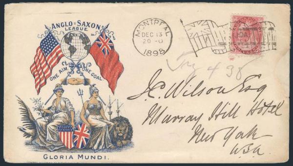 4824 78 image78, Tied by Montreal 13 Dec, 1898 Flag cancel on pretty colour illustrated "GLORIA MUNDI" Boer War patriotic cover. Printed by J.C. Wilson of Montreal. F, edge flt at right (Image) Estimate 100.00+ $Cdn