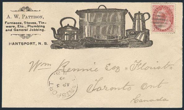 4825 78 image78, On cover with Hantsport, NS 3 Apr 1899 postmark and beautiful illustrated advertisement for A.W. Pattison Furnaces, Stoves, Tinware, etc. F-VF. Has V.G. Greene h/s on reverse (Image) Estimate 100.00+ $Cdn