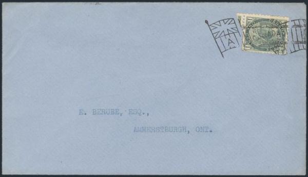 4813 75 image75, Tied by scarce FLAG #8-17 WITH NO HUB, on printed matter unsealed envelope to Amherstburg Ont (b/s 21 Aug, 1900). VF (Image) Estimate 125.00+ $Cdn