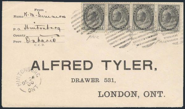 4810 74 image74 (4), Tied by grid cancels on cover from Hintonburg Ont 24 Dec, 1900 with pre-printed address to Alfred Tyler in London Ont (rec b/s). VF (Image) Estimate 65.00+ $Cdn