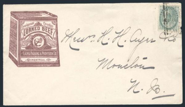 4812 75 image75, Tied by Montreal roller cancel on illustrated advertising cover (unsealed) for CORNED BEEF. Addr to Moncton NB (rec b/s 11 May, 1899). VF (Image) Estimate 50.00+ $Cdn