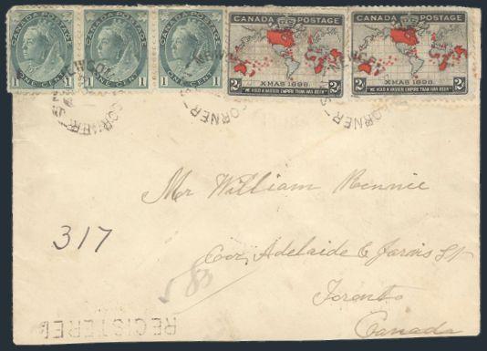 4816 75, 85 image75 (Strip of 3), 85 (2), Tied by Newcombs Corner, NS 1 Apr 1899 split-ring cancels on Reg'd cover to Toronto. Has Middle Musquodoboit, Shubenacadie, Halifax & St. John RPO transits. F, some light soiling. An attractive Map cover (Image) Estimate 125.00+ $Cdn