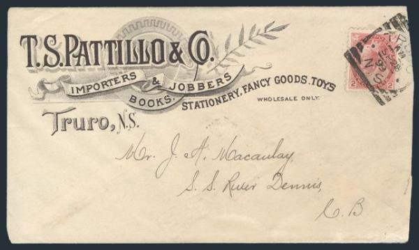 4822 77 image77, Tied by Truro, NS 28 Sept 1899 squared circle cancel on fancy advertising cover for T.S. Pattillo & Co. Addr to River Dennis, CB (28 Sept b/s). F, slightly reduced (Image) Estimate 50.00+ $Cdn