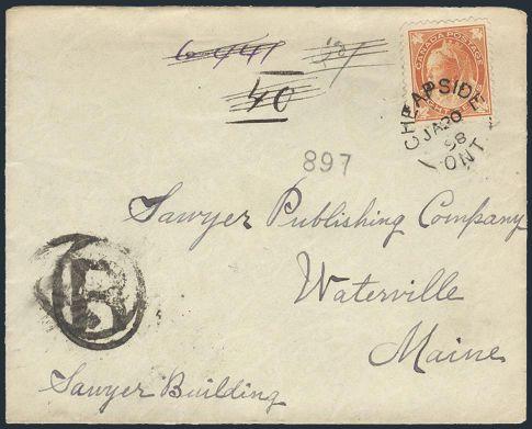 4807 72 image72, Tied by Cheapside, Ont 20 Jan 1898 split-ring cancel on Reg'd cover to Waterville, Maine. Has Jarvis, Ont, Montreal squared circle cancel Precursor & Portland, Me transits. F. Attractive (Image) Estimate 75.00+ $Cdn