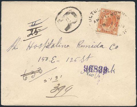 4808 72 image72, Tied by Cultus Ont / Canada 11 Apr 1898 split-ring cancels on Reg'd cover to New York (14 Apr b/s). Numerous nice b/s's incl Clear Creek, Port Burwell, Tilbury, etc. F-VF (Image) Estimate 75.00+ $Cdn