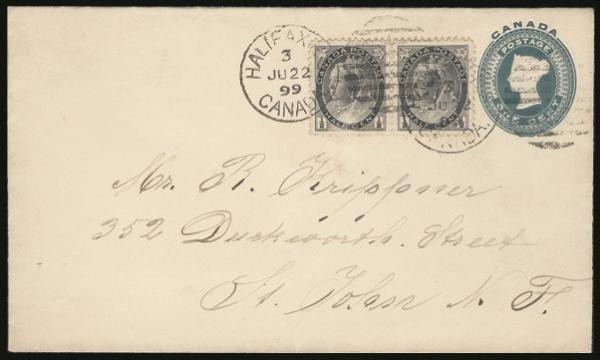 4809 74 image74 (Pair), Tied by Halifax 22 June 1899 duplex cancels on QV 1¢ postal stationery envelope (U9), paying 3¢ rate to St. John's, Newf'd; 26 June b/s. Addr to R. Krippener the famous designer of the Newf'd Royalty covers. VF. Ex Steinhart (Image) Estimate 75.00+ $Cdn