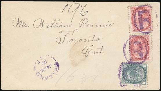 4815 75, 78 image75, 78 (2), Tied by violet 'R' cancels to a Reg'd cover dated by violet Welland Ont 26 Jan 1899 split-ring to Toronto. F, central age spot (Image) Estimate 45.00+ $Cdn