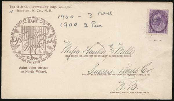4819 76 image76, Tied on 1899 advertising cover for FLEWWELLING MATCHES with illustrations on both sides. Addr to Sussex NB (rec b/s). F, slight creases (Image) Estimate 65.00+ $Cdn