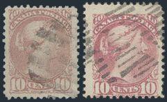 40 (26), 45 (30), Stockcard full of 10¢ Small Queens. Has a wide array of shades (incl rose lilacs, magentas, brown reds, dull roses, etc); plus corks; CDS's; duplexes; grids; SE single with double perf; strip of 4; etc. A great lot for study. Mostly VG-VF. Cat $2,500 (56 stamps) (Image)