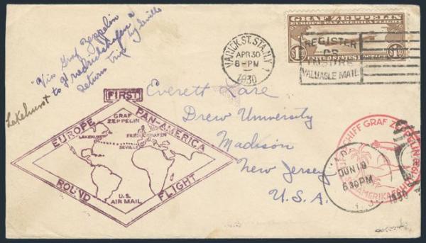 C14, $1.30 Zeppelin tied by Varick St Sta, NY 30 Ap, 1930 slogan cancel on First Europe Pan America Round Flight cover. Has 2 diff Zeppelin cachets and on reverse has illustrated New York h/s plus Friedrichshafen CDS. F, some minor gum residue around stamp (Image)