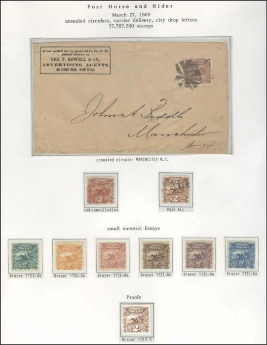 113, Album page with a specialized collection of the 1869 Post Horse Rider 2¢. Has 2 used singles (one with red cancel, other with PAID ALL cancel, these Cat $280); nice circular advertising cover from New York, Cat $150); 6 "SMALL NUMERAL" perforated Essays; and one imperf Proof. F-VF (10 items) (Image)