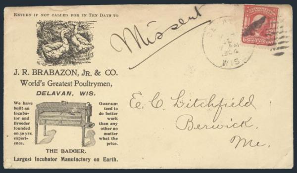 Interesting collection of 19 illustrated advertising covers from 1880's-1925. Wide variety of products and services offered incl Poultry, Machinery, School Supplies, Fish, Sawing Machine, Hardware, etc. Mostly VG-F (19) (Image)