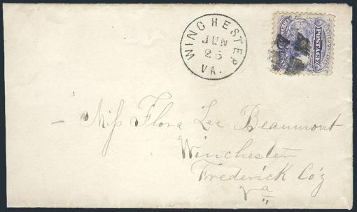 114, Collection of 3¢ Locomotive covers with all diff town cancels, circa 1869-70. Incl Winchester Va, Palmyra Mo, Parkersburg WV, Baltimore MD (has embossed corner card for shipping & Commission Merchants), Kingston NY, etc. VG-F (8) (Image)