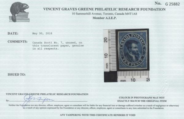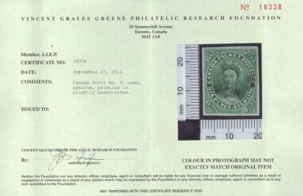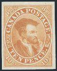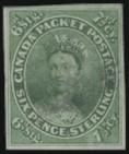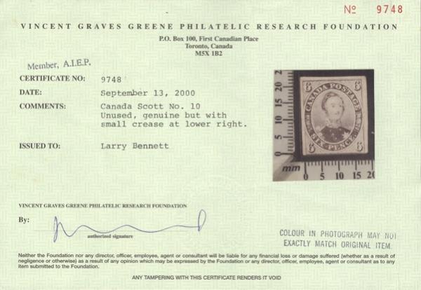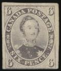 unused Six Pence on thick soft paper, three large margins and just clear at bottom, nice impression. F-VF, NG, tiny barely visible corner crease. Has 2000 Greene Foundation Certificate. ONE OF CANADA'S VERY RAREST STAMPS IN UNUSED CONDITION (Image) (View Certificate)