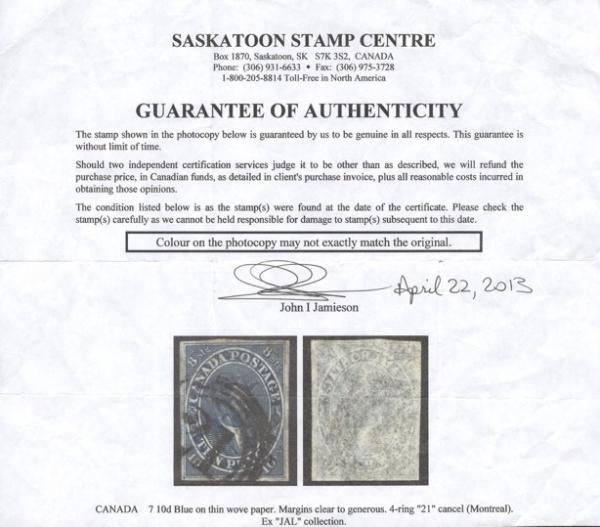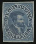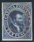 Attractive used Ten Pence Cartier with four full margins. VF, neat four-ring "21" cancel (Montreal). Has 2013 Saskatoon Stamp Centre Certificate (Image) (View Certificate)