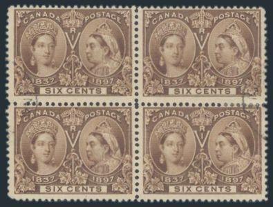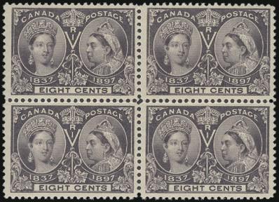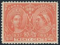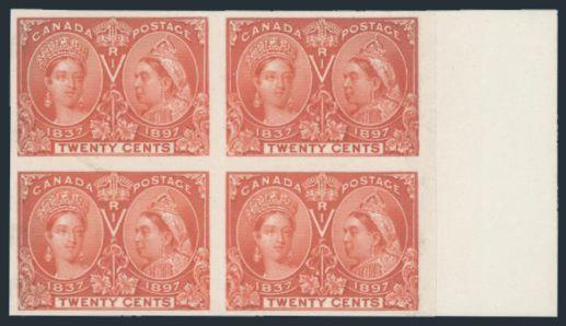 Sheet margin Plate Proof block of the 20¢ Jubilee on card. The UR stamp shows the "W-E" variety. VF (Price listed is for 4 normal proof singles but this is worth considerably more) (Image)