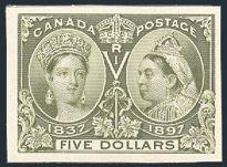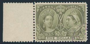 5352 65 image65, Five Dollar Jubilee marginal single, light magenta corner cancel, VF. A LOVELY STAMP! (Image) Cat 1,600.00