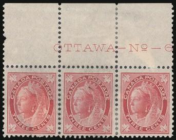 5367 69 image69, Collection of five Plate Imprint strips with 3 or 4 stamps in each. Has Plate #'s 2, 3, 4, 5 & 6. F-VF, two strips have NG, a few reinforced perfs. Scarce group from the L. Hogg collection. Cat $1,445 (Image) Estimate 300.00+ $Cdn
