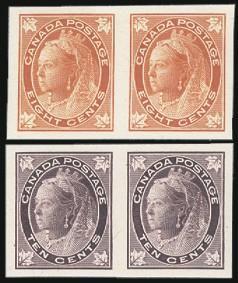 5363 66P-73P image66P-73P, Complete set of QV Leaf Plate Proof pairs on card. Fresh vibrant colours, large margins, VF (8 diff imperf Proof pairs) (Image) Cat 4,000.00