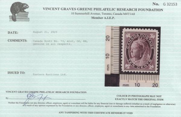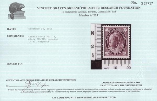 mint 10¢ QV Leaf. F-VF, NH. Has 2019 Greene Foundation Certificate (Image) (View